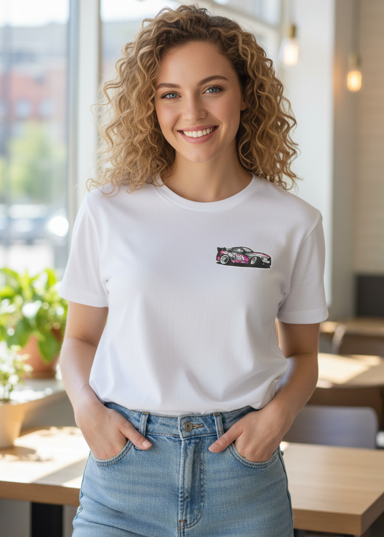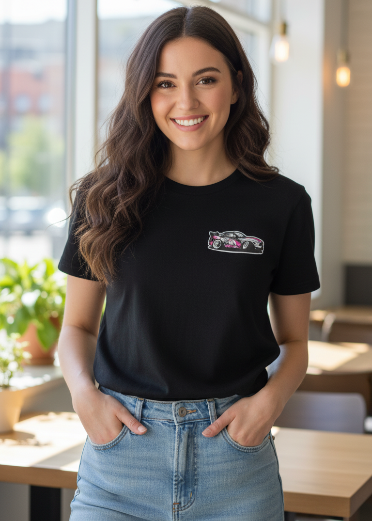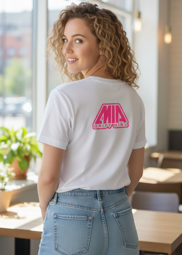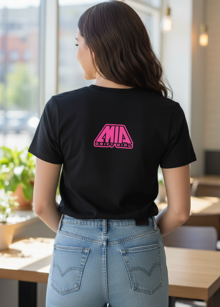 Luce el poder del drift con esta polera exclusiva: el icónico Mustang de Mía Orellana al frente y su logo oficial en la espalda. ¡Estilo racing para el día a día!